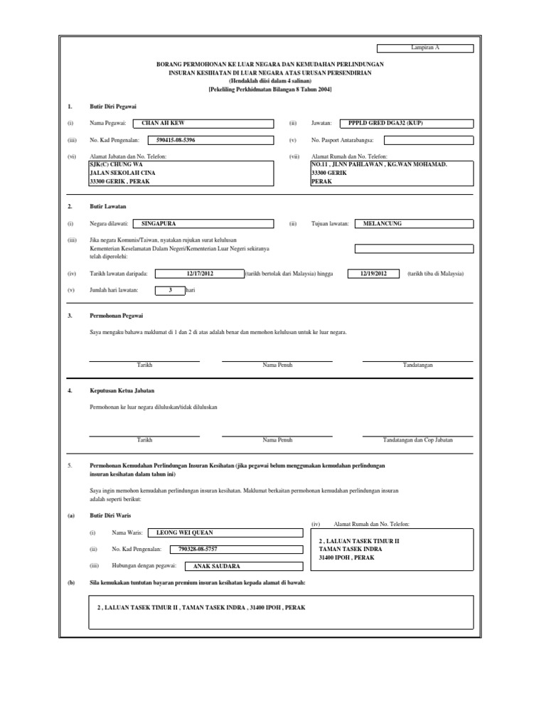 Related : Insuran Ke Luar Negara : Pemohonan kemudahan perlindungan insuran kesihatan (jika pegawai belum..