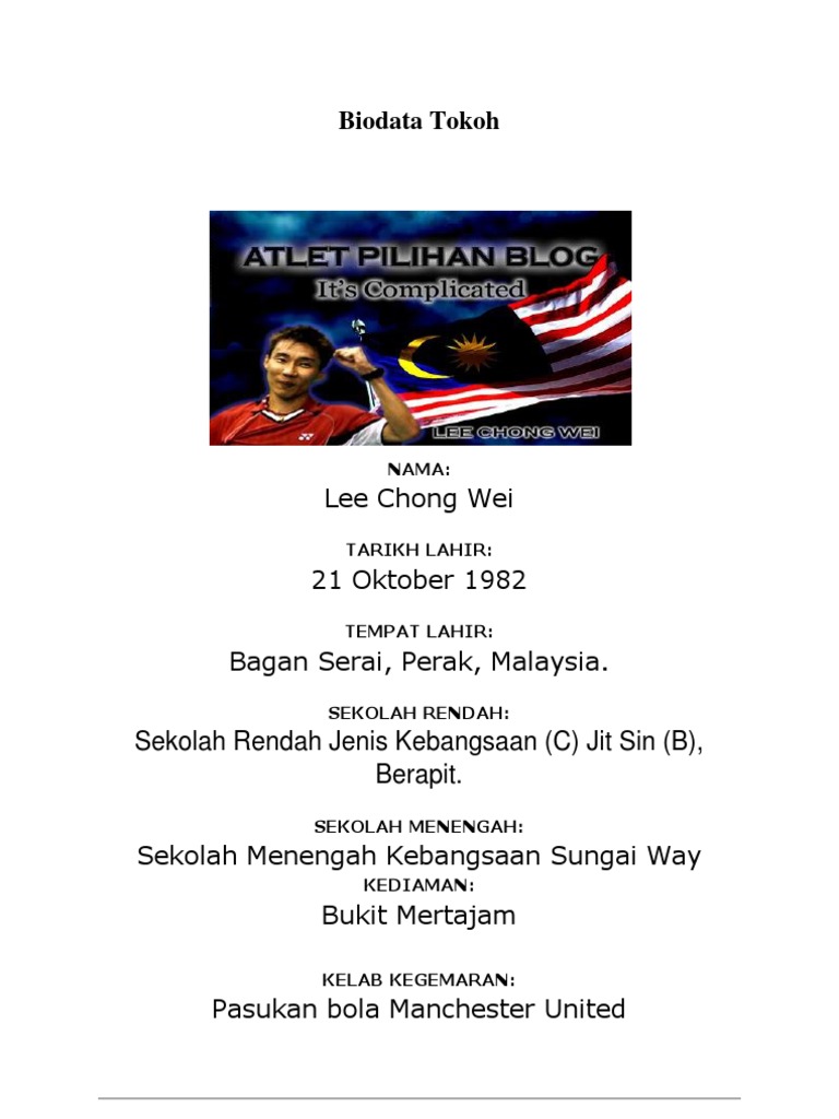 Biodata datuk lee chong wei. See more of info dan berita sukan malaysia on facebook. 27 julai 1972 tempat lahir : Pemain badminton nombor satu dunia selepas mengalahkan lin dan. Pandelela rinong pamg adalah atlet terjun malaysia yang berjaya mengharumkan malaysia dengan menghadiahkan pingat gangsa buat malaysia pada temasya sukan olimpik 2012 di london.